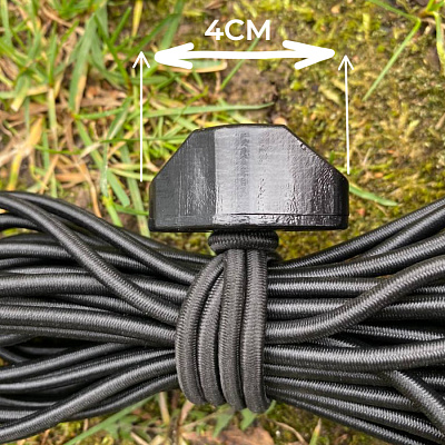 Эластичный шнур – многофункциональный аксессуар, который порадует туриста, путешественника, рыболова, охотника, дачника! Петля широко применяется при монтаже укрывного полотна к опоре. Универсальная петля-фиксатор черного цвета представляет собой шнур-растяжку с износостойким нейлоновым покрытием и специальным фиксатором на конце. Петли просты в эксплуатации, легко устанавливаются и снимаются при перемещении. Основное назначение петли – быстрое, удобное и надежное крепление тентов, чехлов, навеса, пленки, сетки и других укрывных материалов к опоре. Используется для подвешивания тента или брезента. При необходимости можно производить легкий демонтаж укрытия. В данной петле вместо привычного пластикового шарика используется более удобный и функциональный фиксатор, в котором предусмотрены отверстия для металлических скоб: еще легче и быстрее крепить палатку к грунту.