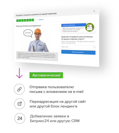 Лид-опросы, сделанные на нашем конструкторе, умеют автоматически отправлять письма, перенаправлять посетителя, добавлять его в CRM систему. Авто-действия продают и "утепляют" клиента без участия менеджера.
