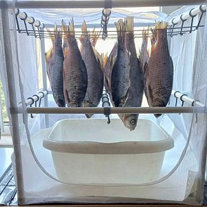 Современные рыболовы используют готовые конструкции - каркасные сушилки для рыбы и мяса. Способ позволяет регулярно сушить рыбу в огромных количествах. Обычно конструкция состоит из деревянного или металлического каркаса, который защищен с каждой стороны тканью или сеткой. Внутри располагаются крепления, на которые подвершиваются особи. Есть варианты как с одним, так и с несколькими ярусами. Сушилку для рыбы можно сделать собственными руками, но проще всего приобрести уже готовое изделие.
