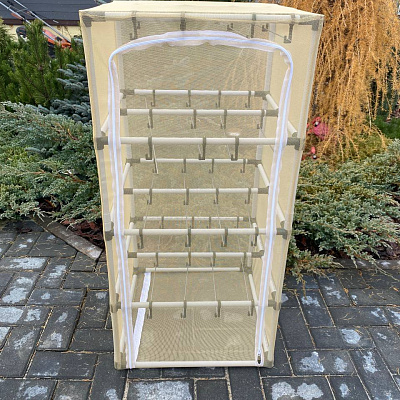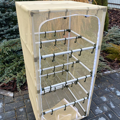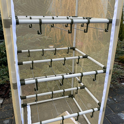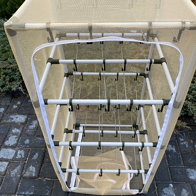 Устройство выполнено в виде куба со стороной 50-100-50 см, что обеспечивает оптимальную площадь для размещения большого количества рыбы или мяса. Каркас изготовлен из высокопрочного пластика, который отличается легкостью и устойчивостью к механическим повреждениям. Общая грузоподъемность каркаса достигает 40 кг, что позволяет загружать значительное количество продуктов за одну сессию сушки.