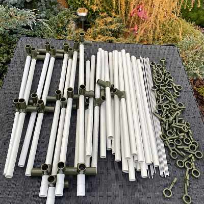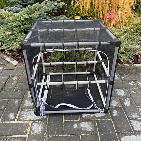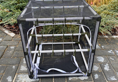 Сушилка для рыбы фруктов и мяса выполнена в виде сборной конструкции. Каркас трубчaтый плaстиковый собирается через пластиковые уголки, что позволяет разместить внутри сушилки большое количество продуктов питания, требуемых сушки. На пластиковый каркас натягивается москитная полиэфирная сетка с мелкой ячейкой, которая пропускает внутрь достаточно количество свежего воздуха, но препятствует прониканию мух и других насекомых.